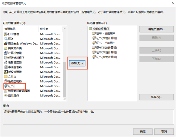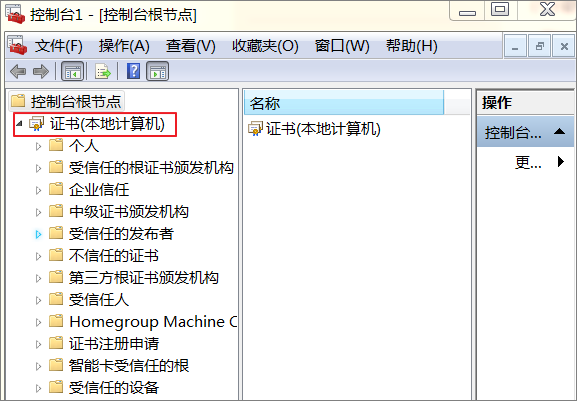4)在控制台左侧导航栏单击控制台根节点下的证书打开证书树形列表。
