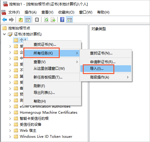 5)在个人右键菜单中选择所有任务 > 导入,打开证书导入向导对话框,并单击下一步。