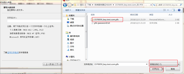 注:在导入证书文件时,文件名右侧文件类型列表中请选择所有文件类型。