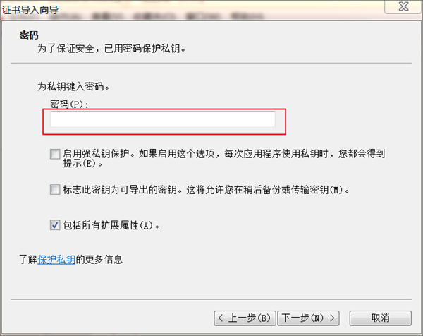 6)在要导入的文件页面单击浏览导入下载的PFX格式证书文件,并单击下一步。