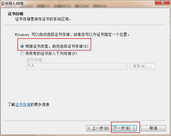 8)选择根据证书类型,自动选择证书存储并单击下一步完成证书的导入。