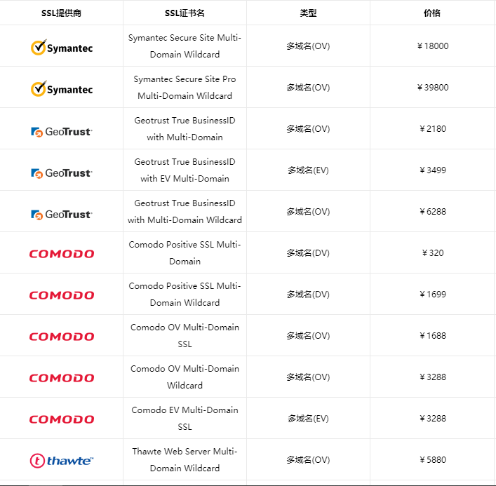 以上都是国际知名SSL证书品牌,权威的CA机构,非常靠谱。并且从图片来看,价格也算便宜,毕竟一张多域名证书可以保护2-250个不同的域名(主域或子域都可以),相比每一个域名都去申请一张单域名SSL证书要划算的多。