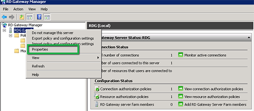 2、在远程桌面网关管理器控制台树下,右键单击 RD 网关服务器并选择Properties