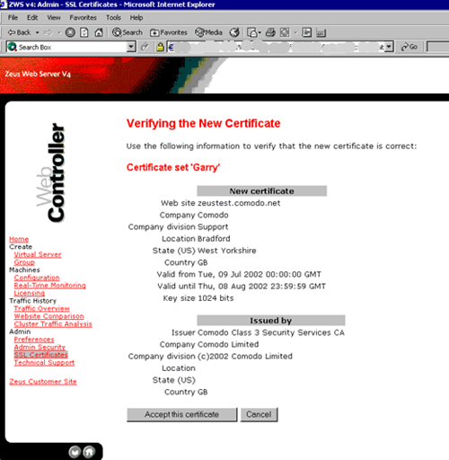 接下来登录到Zeus Web服务器并在左侧菜单中选择 SSL 证书。