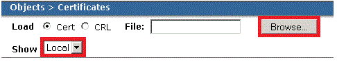 2、将出现一个对话框,在其中单击名为“显示”的下拉菜单并选择“本地”。之后,浏览您之前保存的主证书文件 (domain_name.crt)。选择文件并单击加载。