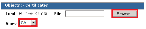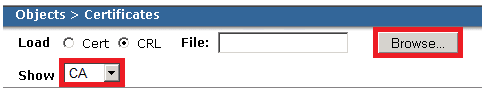 4、现在您必须加载根证书,单击“显示”下拉菜单并选择“CA”。浏览并选择根证书文件 (TrustedRoot.crt),然后单击加载。