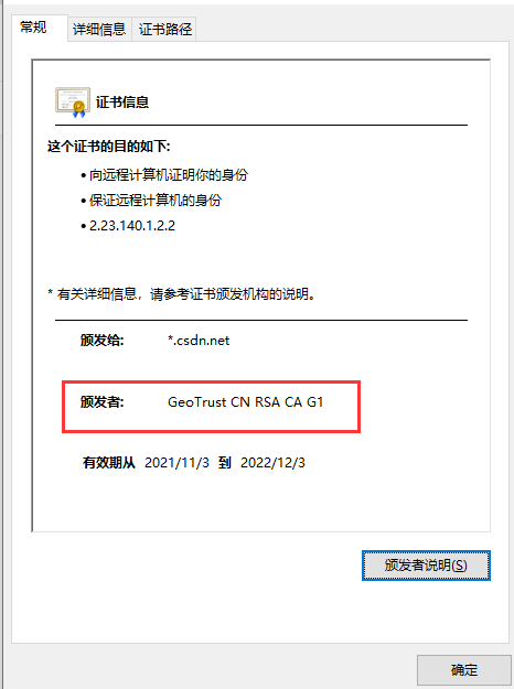 打开360浏览器-输入CSDN网址-点击绿色小锁-点击证书信息,在常规里面就能看到颁发者信息,使用的是GeoTrust的一款SSL证书。