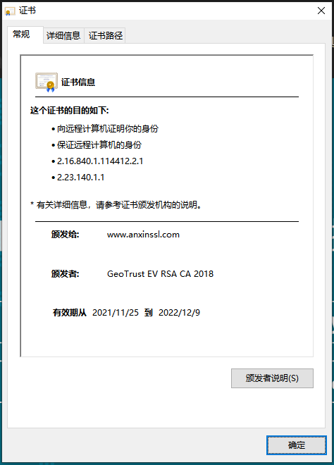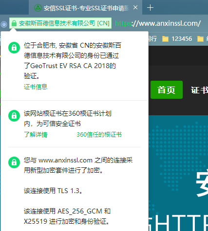 如果一个网站、系统或平台安装部署了SSL证书,并且证书正常运行,那么我们就可以从浏览器地址栏找到该网站的证书,并查看其内容。今天我们以安信证书官网使用的证书为例,来探讨从SSL证书中能看出哪些信息。