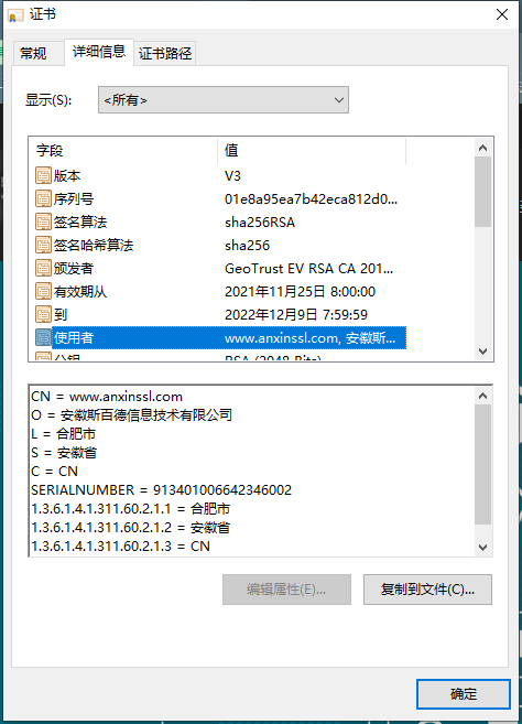 在使用者字段中,如果有O字段则说明该证书是OV企业型证书,如果有有企业组织机构代码则说明该证书是EV增强型证书。