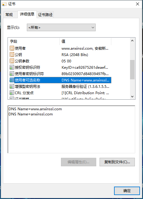 使用者备用名称列出证书支持的所有域名,如果只有一个域名(包括带www和不带www)则说明该证书是单域名证书。如果有多个域名则说明该证书是多域名证书,如果带有*.前缀的域名则说明该证书是通配符证书。