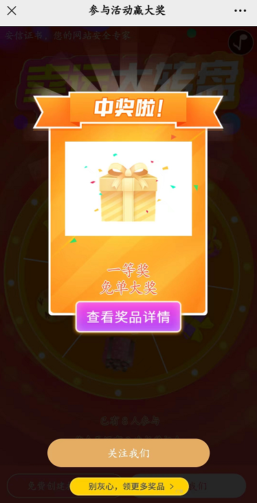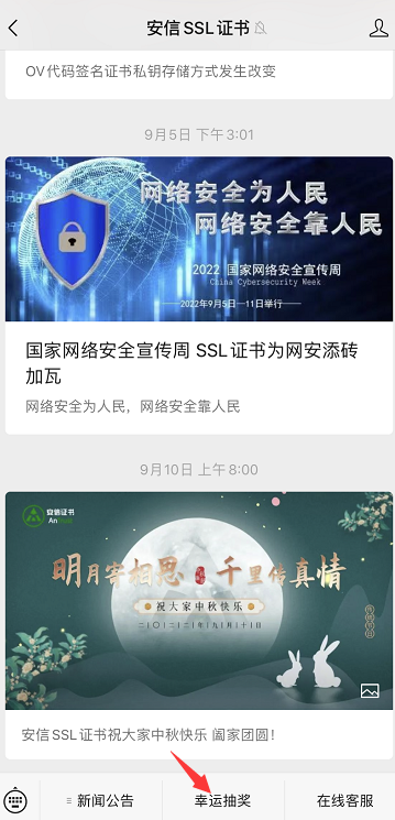 参与方式:关注“安信SSL证书”微信公众号(即可免费获取3次抽奖机会),点击“幸运抽奖”
