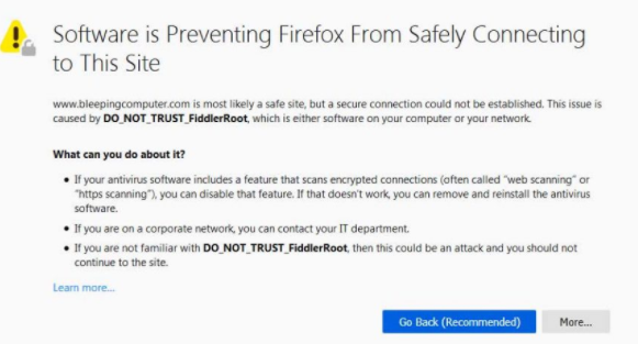 如果在多个不相关的 HTTPS 网站上看到 Firefox 错误“ SEC_ERROR_UNKNOWN_ISSUER ”,则意味着第三方正在中断并注入 Firefox 浏览器不信任它的证书。在大多数情况下,在扫描加密连接期间,防病毒软件会错误地让浏览器相信服务器上正在进行 MiTM 攻击,并向用户发出“ MOZILLA_PKIX_ERROR_MITM_DETECTED ”警告。如果防病毒扫描或系统重启不起作用,则意味着您需要手动删除文件 cert8.db,因为它可能已损坏。