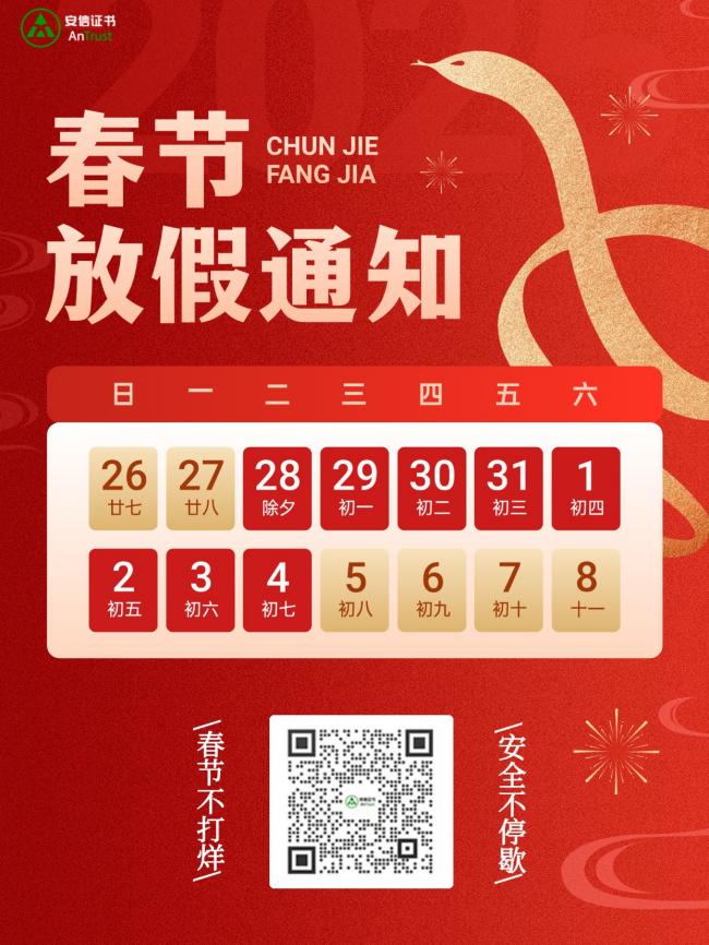 祥蛇贺岁,福满人间。安信证书向广大客户朋友致以最诚挚的节日问候!感谢您在过去一年里对我们的信任与支持,您的满意是我们不断追求卓越的最大动力。为提前做好春节前后各项工作安排,根据国务院办公厅的规定,并结合我司实际情况,现将2025年春节放假时间安排如下: