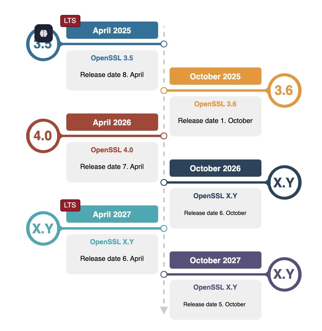 据介绍,OpenSSL 3.5.0将成为下一个长期稳定(LTS)版本。根据OpenSSL的LTS政策,3.5将持续支持至2030年4月8日。