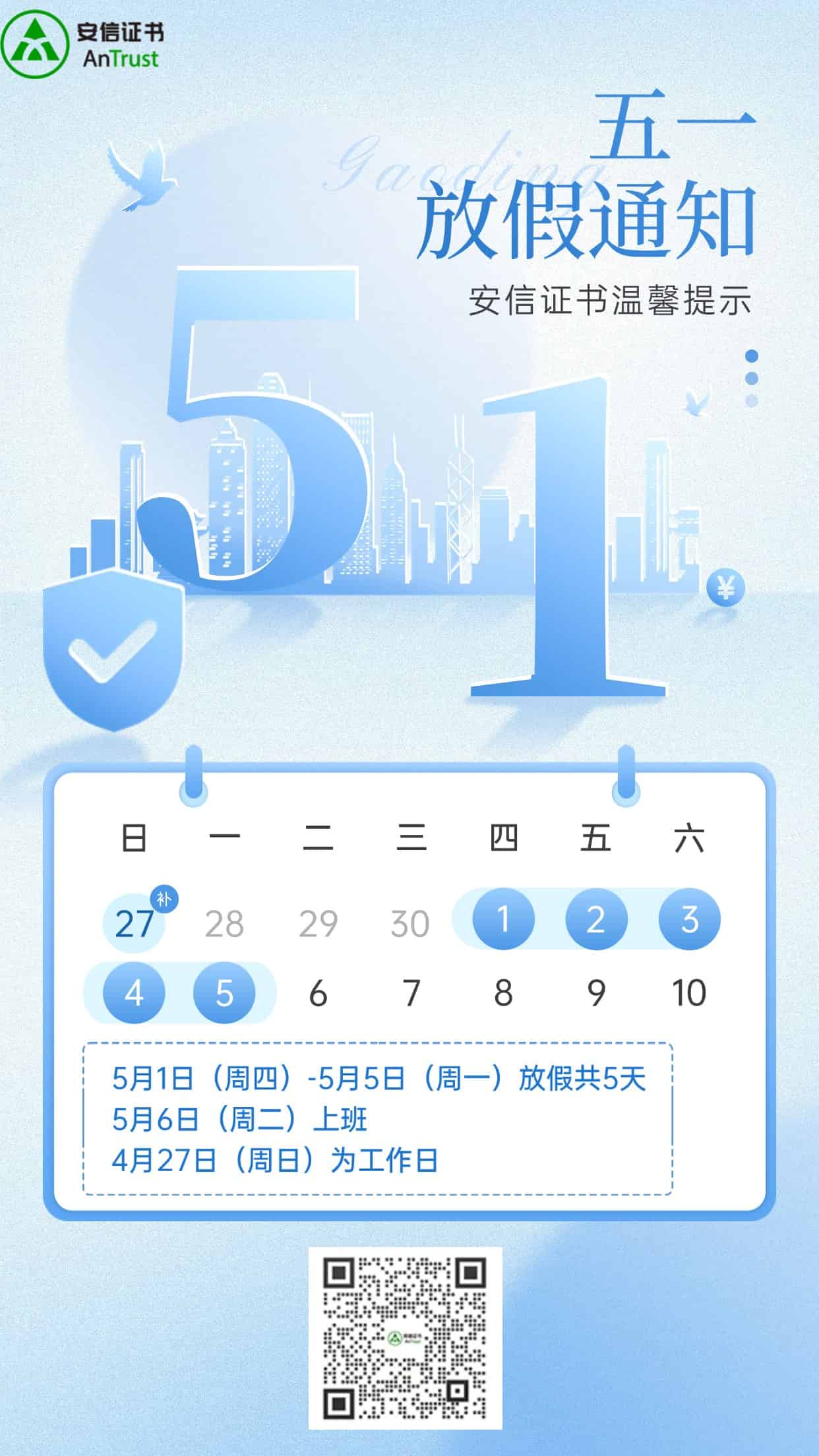 所有耕耘,终有收获。2025年劳动节假期将至,安信证书致敬每一位劳动者,感谢大家一直以来对我们的支持与信赖。根据国家节假日放假规定,并结合公司实际情况,现将2025年劳动节放假安排通知如下: