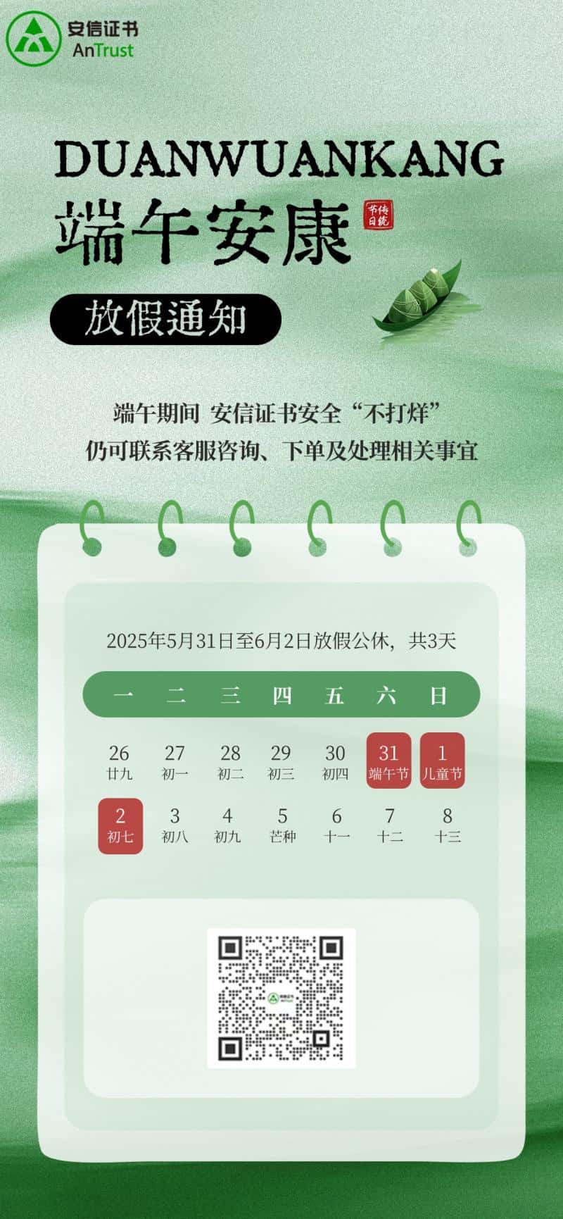 仲夏已至,又是一年端午节,根据《国务院办公厅关于2025年节假日安排的通知》及结合公司实际情况,安信证书2025年端午节放假时间安排如下: