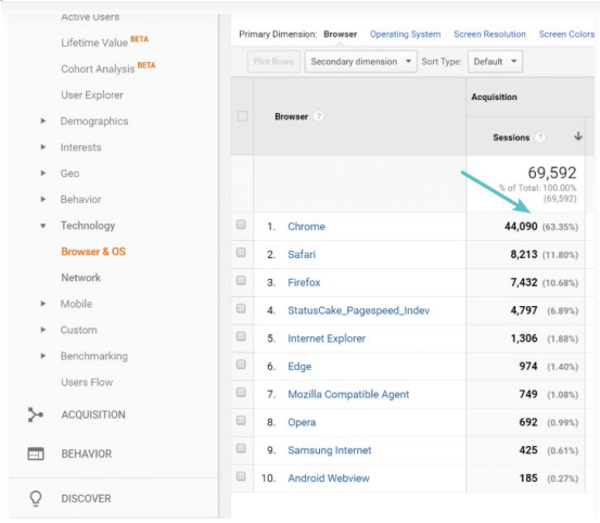 Chrome拥有超过56%的浏览器市场份额,因此这会影响到很多访问者。 下图的图片中可以看出,超过63%的网站访问者使用的是Google Chrome。