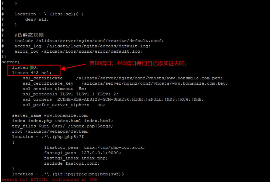 如图我们找到了80端口,刚开始查看客户的80号时,默认没有443端口,但是安装证书需要443端口,于是在正确的网站配置文件里添加了443端口号;
