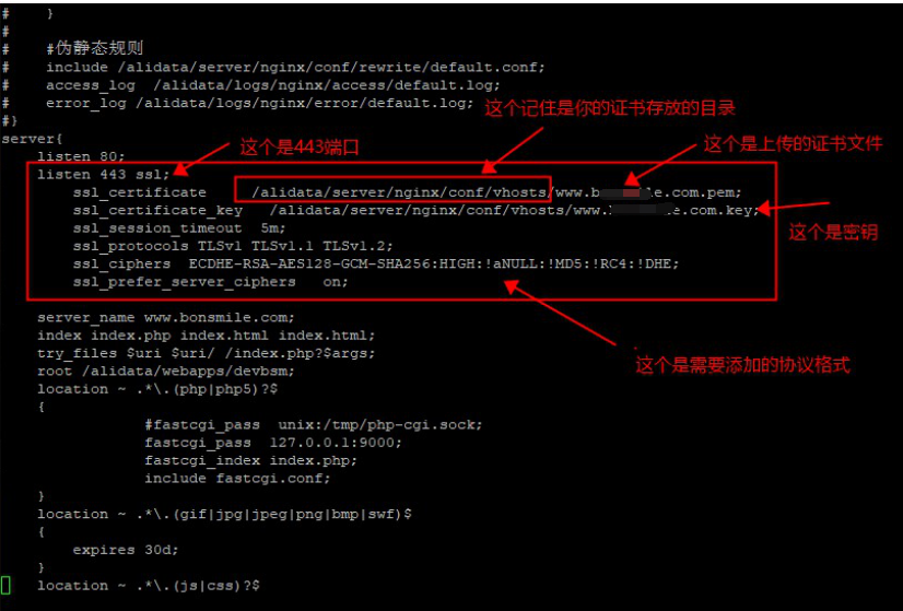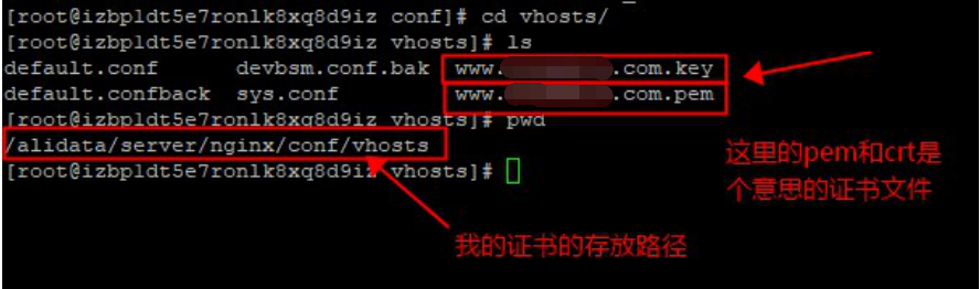如上图所示小编的证书的存放路径是:/alidata/server/nginx/conf/vhosts
