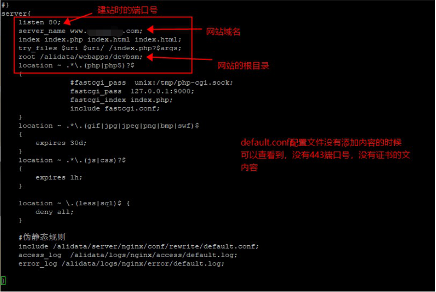 3.安装SSL证书我们还需要知道网站的安装配置路径目录,可以问客户网站的安装配置路径,如果客户不能提供就需自己去查找,一般网站的配置文件里面都会有80或者443端口号,网站的配置文件一般命名为 “default.conf”