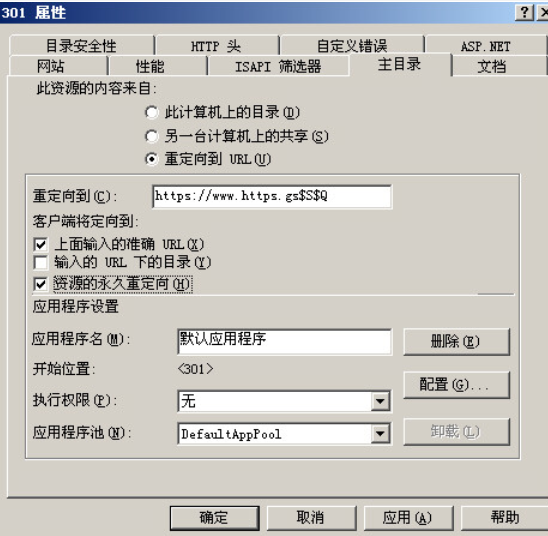 步骤五、创建好后站点后,选择该站点,点击鼠标右键–“属性”–“主目录”,按照下图设置,选中“重定向到URL”,重定向的地址是“https://www.https.gs$S$Q”并勾选“上面输入的准确URL”和“资源的永久重定向”两个选项即可。
