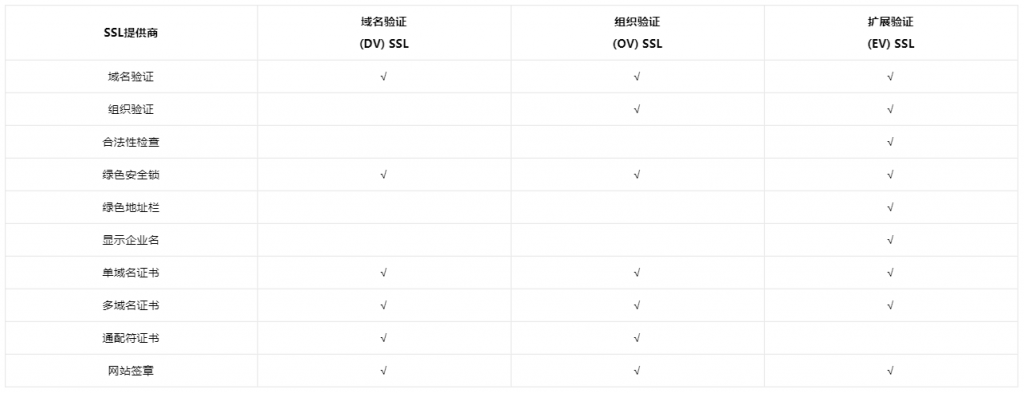 多域名SSL证书分为三种验证等级: 域名型(DV SSL证书)、企业型 (OV SSL证书)和 增强型(EV SSL证书) ,它们之间的区别与比较: