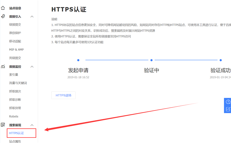 接下来,全站做301跳转,将所有的http区别跳转至https。在向别的站长平台提交https站点,如图: