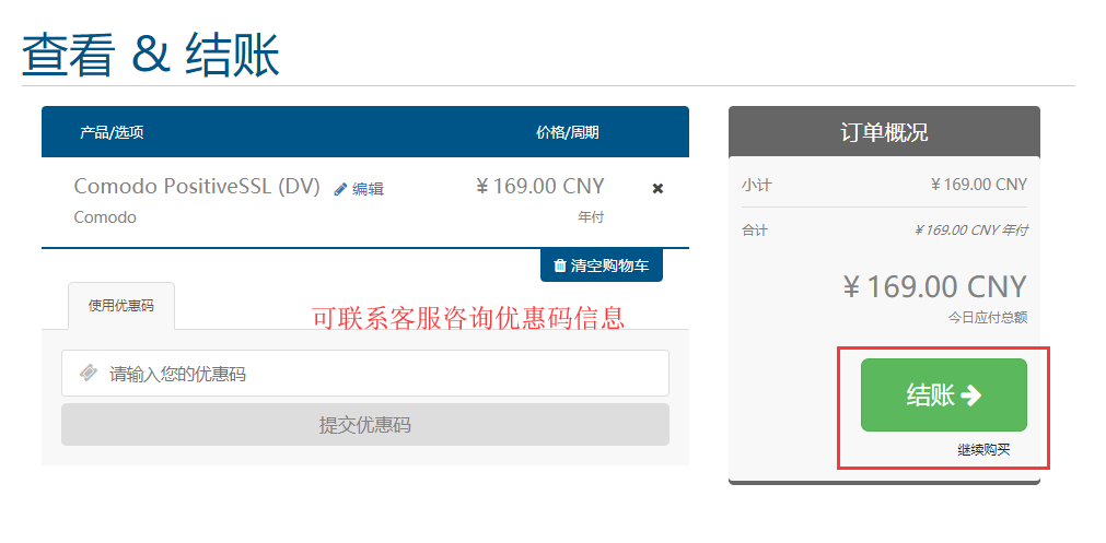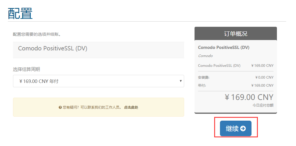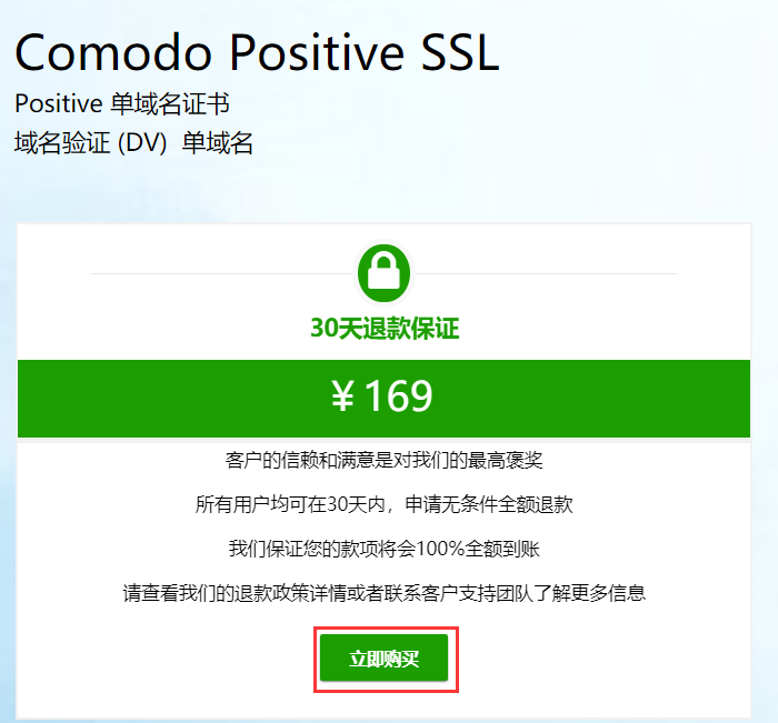 二、接下来我们以comodo的169元/年的DV SSL证书为例,点击“立即购买”