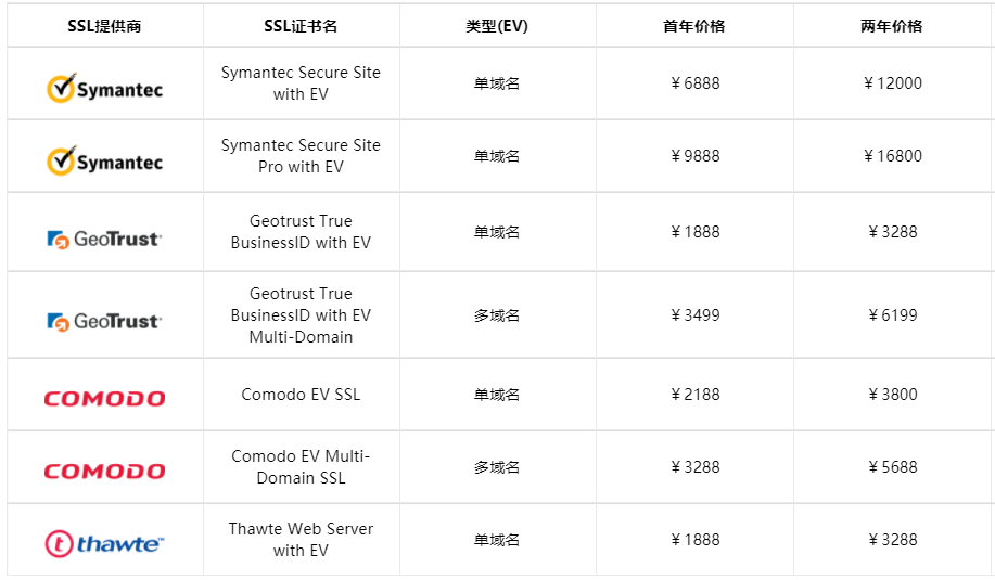 高级增强型EV SSL证书多少钱?安信SSL证书提供的EV SSL证书价格表: