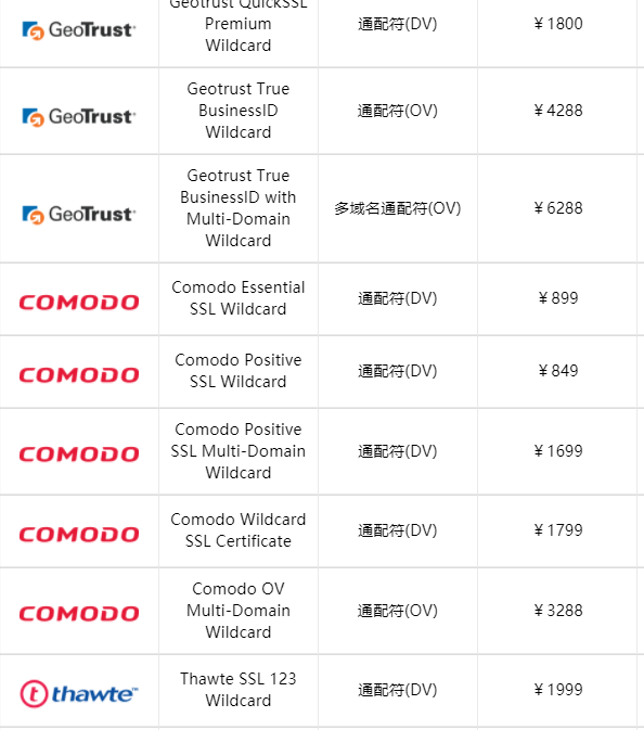 安信SSL证书可提供Symantec、GeoTrust、Comodo、Thawte以及RapidSSL等多家全球权威CA机构的颁发的通配符证书,价格一般在百元至万元之间,如图:(点击图片可查看更多通配符证书价格)