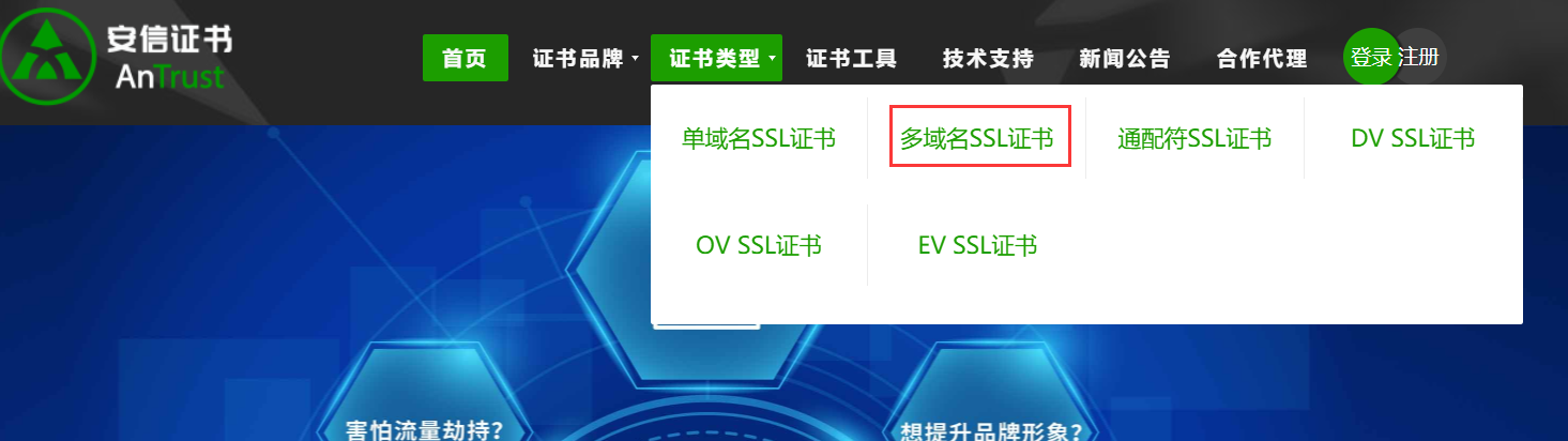 (1)进入安信SSL证书官网(https://www.anxinssl.com)选择菜单栏的多域名SSL证书板块