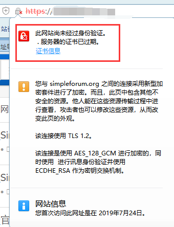SSL证书过期了需要及时续费,或者重新购买一张新的SSL证书安装。如果不续费的话,就会引发各大浏览器的不信任,而且会显示如图样式:
