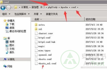 步骤四、依次打开phpstudy安装文件,打开Apache打开conf文件,在conf文件夹中创建一个名为vhosts_ssl.conf的配置文件。