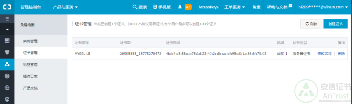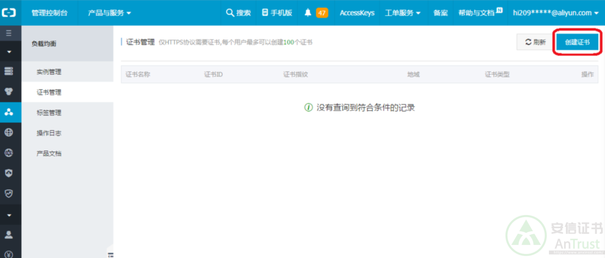 (1)将证书上传至阿里云服务器;点击“负载均衡”-“证书管理”-“创建证书”