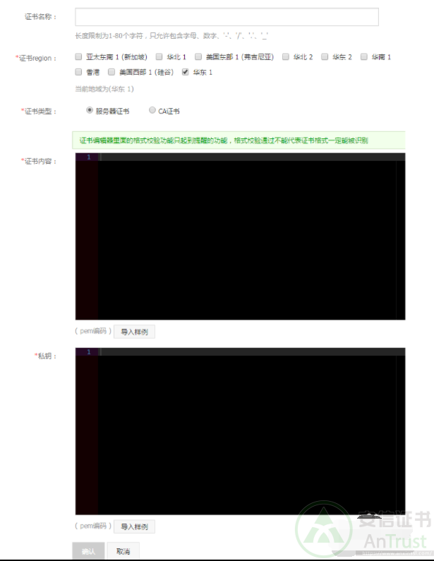 “证书region”请选择要使用证书的地域。目前如需要在多个地域使用证书,请在多个地域上传。