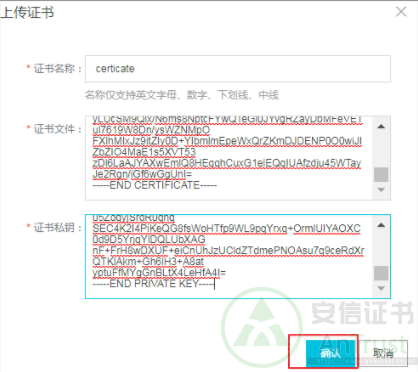 (2)输入从安信证书客服处获得的证书文件,将后缀为.pem或.crt的内容拷贝至证书文件对话框中,将证书私钥文件(文件格式或后缀为.key)内容拷贝至证书私钥对话框中。