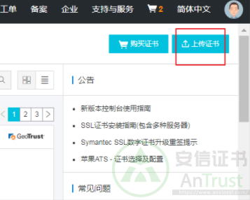 (1)上传证书至阿里云;登录阿里云SSL证书控制台,单击证书页面右上角上传证书。