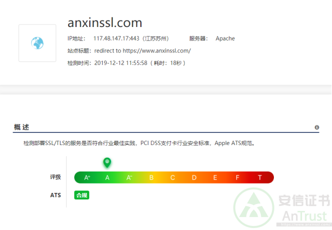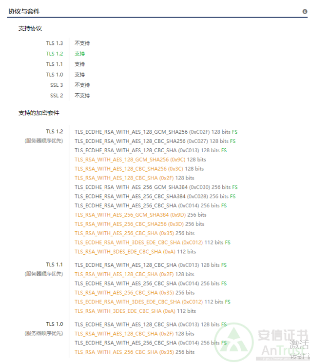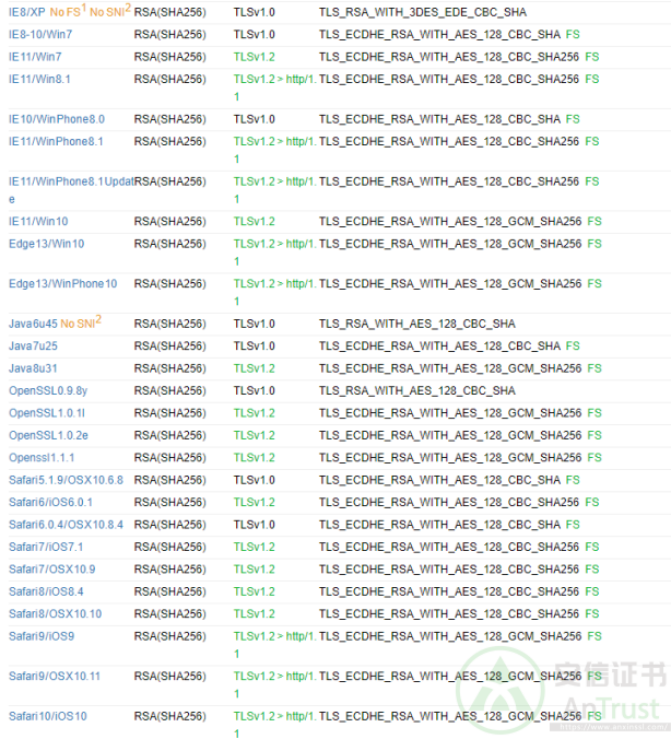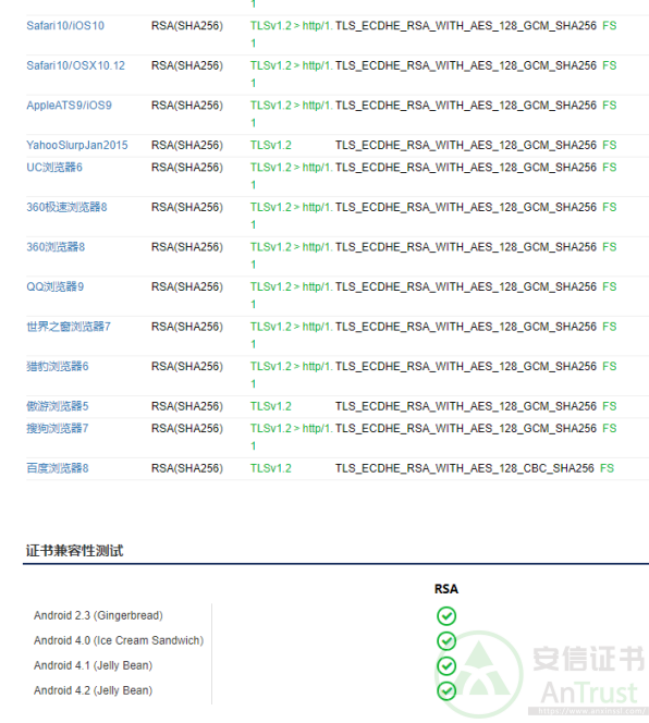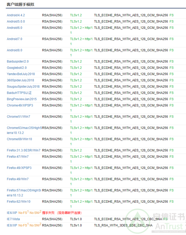 以安信证书官网安装证书为例,我们在评估兼容性和安全性后,采用了TLSv1.0+TLSv1.1+TLSv1.2的SSL协议,安全加密套件使用了不带RC4的加密套件,并且设置了优先使用FS系列加密套件。通过myssl官网检测,除了XP系统下IE6浏览器不支持外,其余都是支持的,并且安全性也得到了极大的提升,安全评估为A级。