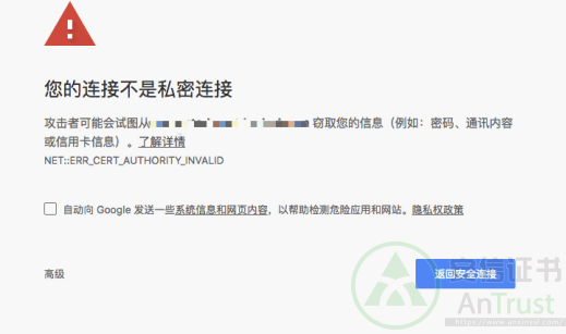 浏览器的处理:现代的浏览器都有证书自动下载的功能,但很多浏览器在安装后是使用系统内置的证书库,如果你缺失的那张CA证书,在系统的内置证书库中不存在的话,用户第一次访问网站时会显示如下情况:(以Chrome为例)