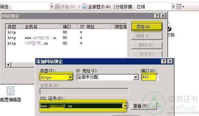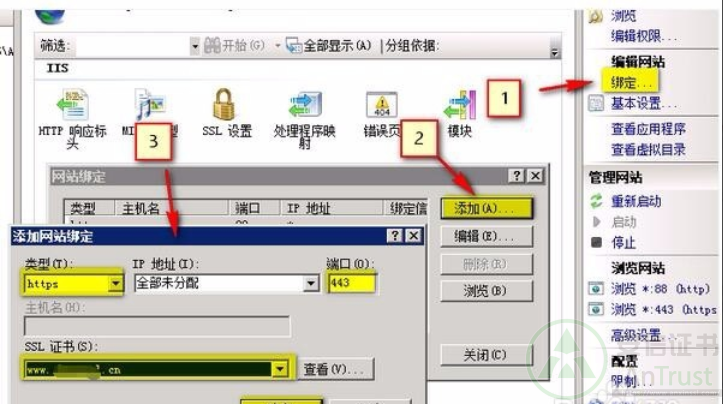5、绑定端口;在IIS管理器的左侧找到你要安装SSL证书的站点,然后点击右侧的“绑定” ,接着点击添加,选择类型为 https 端口为443 ,SSL证书为刚才所填写的有好名称的证书。