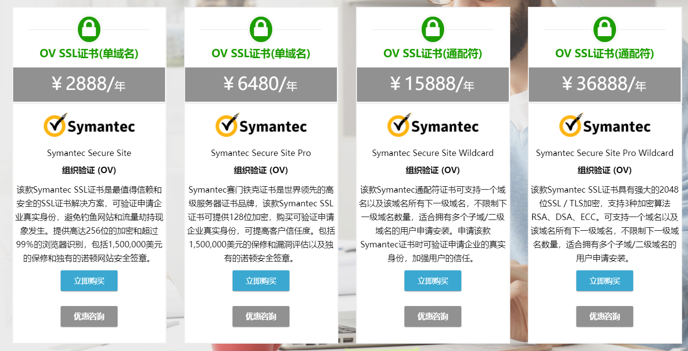 安信证书专业提供国际知名品牌SSL证书申请安装,其中包括Symantec SSL证书,选择一款合适的SSL证书。
