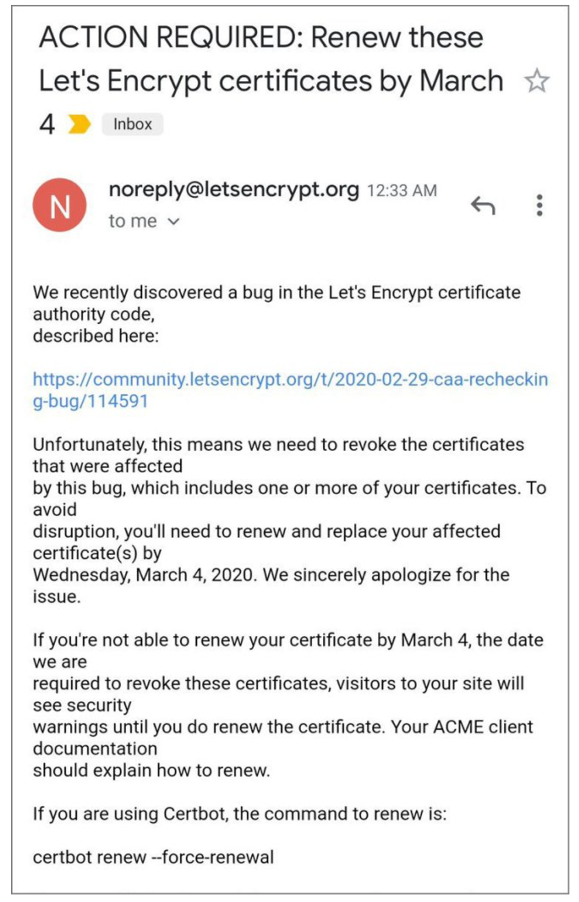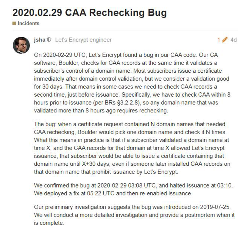 2 月底的时候,Let’s Encrypt发现其证书颁发机构(CA)中的软件漏洞导致某些证书不能通过为关联域配置的证书颁发机构授权(CAA)正确验证。