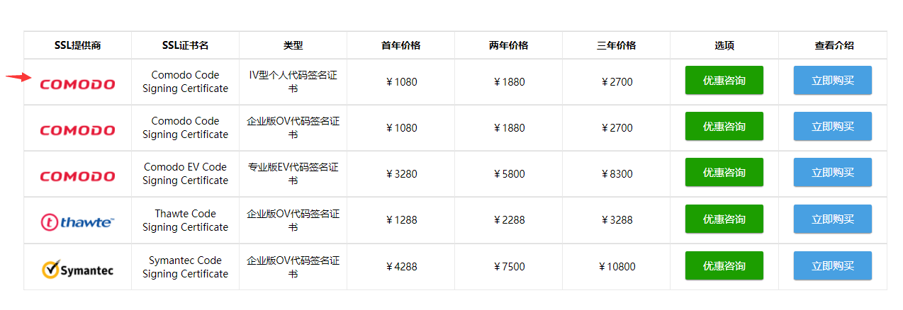点开代码签名证书产品页面: