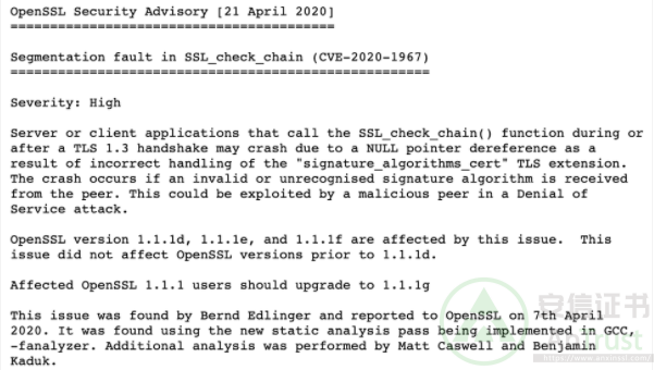 注:本次漏洞只影响OpenSSL 1.1.1(1.1.1d,1.1.1e 和 1.1.1f)用户,OpenSSL 1.1.1d 之前的版本不受此漏洞影响。