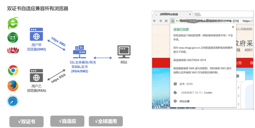 当用户使用 Chrome、火狐、IE、Safari 等不支持国密算法的全球通用浏 览器访问时,自动采用 RSA 算法 HTTPS 加密,自适应兼容所有浏览器及移动终端,基于稳 步推进、分步实施原则,推动国密算法普及应用。